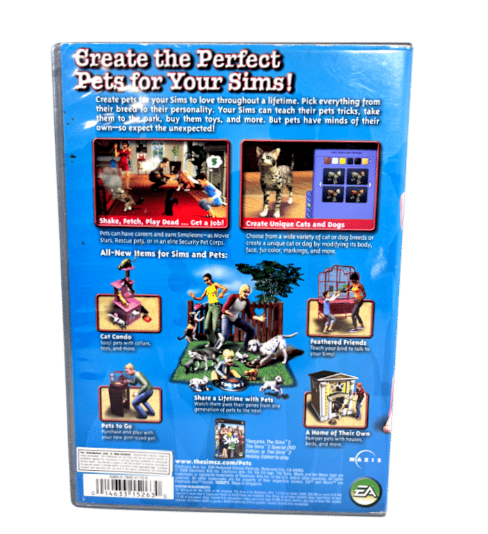 The Sims 2: Pets is an expansion pack for The Sims 2 that allows players to introduce cats, dogs, birds, and womrats (a fictional rodent) into their Sims’ lives. Players can customize pets’ appearances, personalities, and train them to perform tricks. Pets have their own needs and can even have careers. The game also introduces new items, buildings, and accessories for both Sims and their pets.
