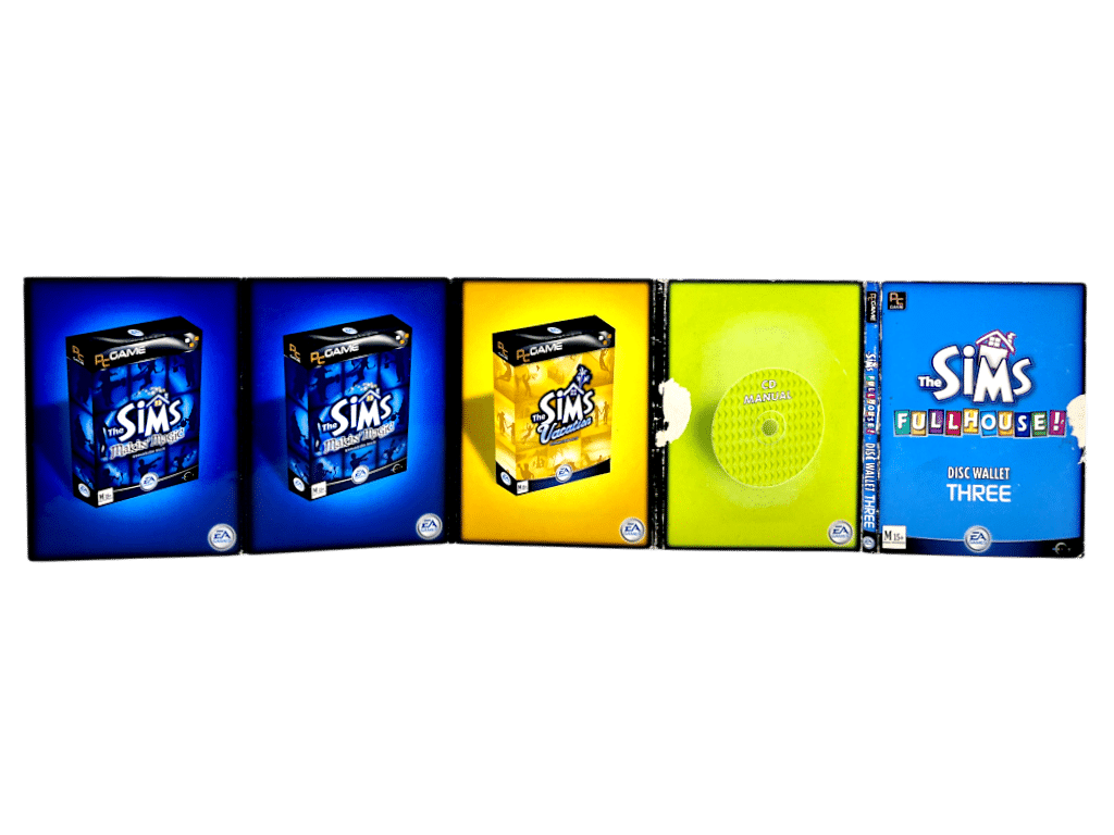 The SIMS Full House Disc Wallet 3 (PC) 4 GAME BUNDLE. This preowned SIMS PC game includes pictured fold out cardboard display box / case + 4 discs. Features artwork on both sides of the foldout box / sleeve. All discs in very good condition with faint markings and feather scratches only. Box shows some pictured shelf wear, but is structurally sound and still displays well. Refer photographs.