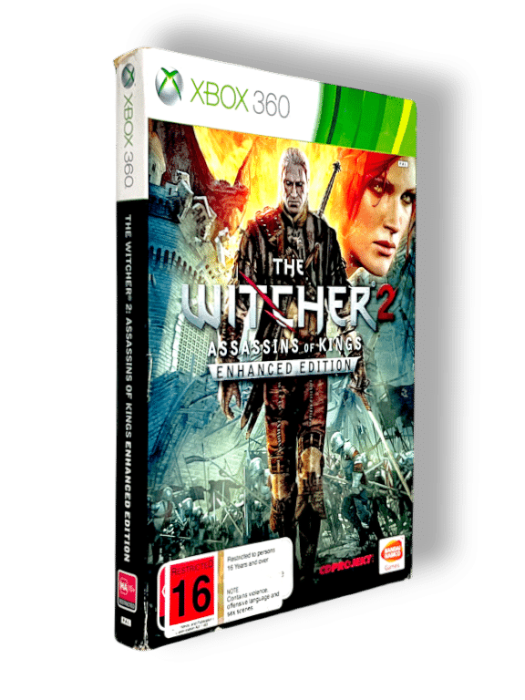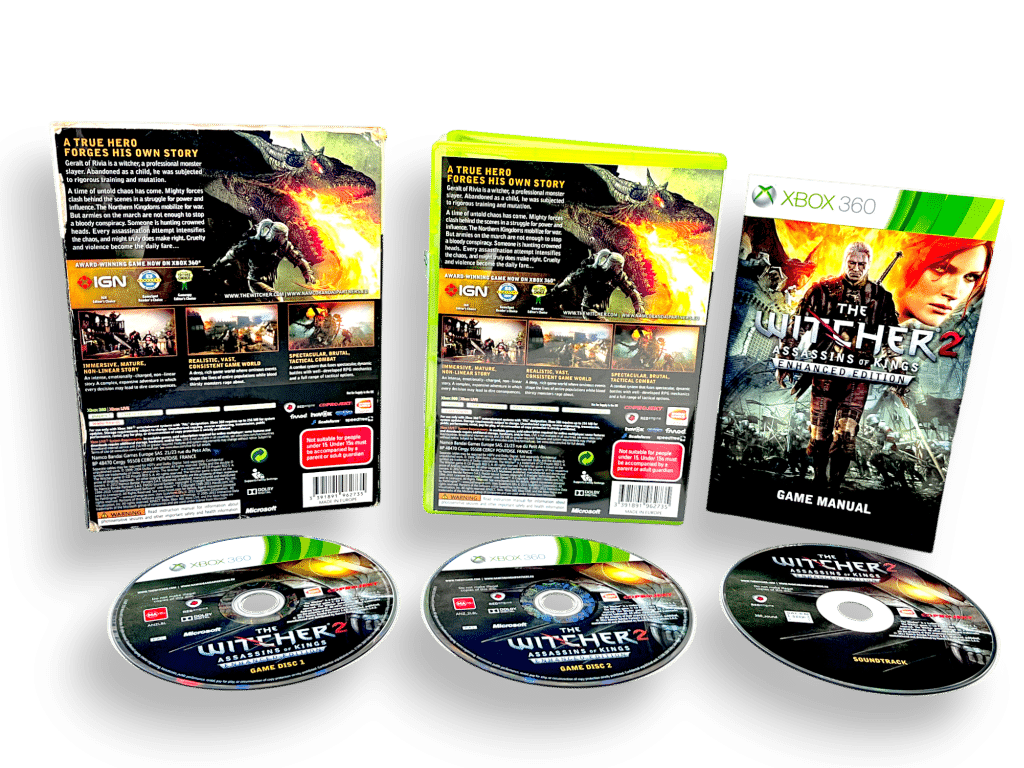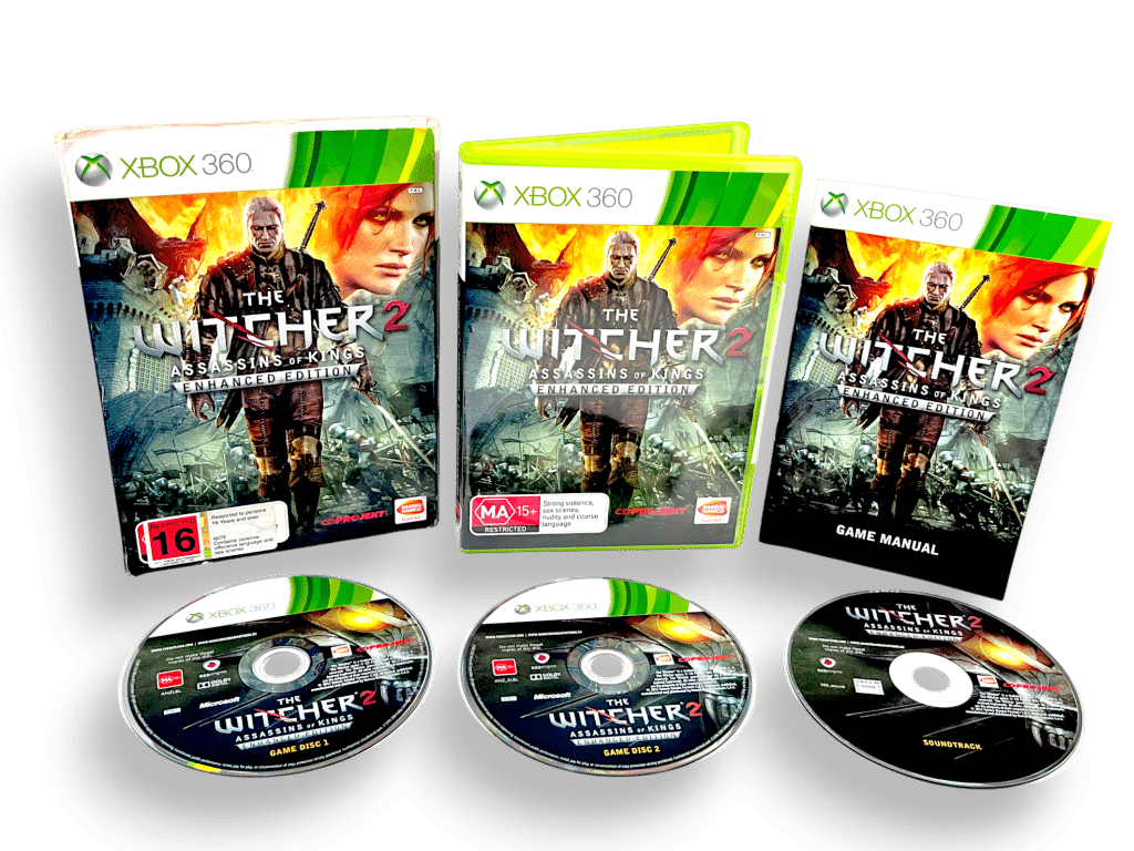 The Witcher 2: Assassins of Kings ENHANCED EDITION (XBox 360) 3 DISC BOXED EDITION in excellent condition: The Witcher 2 Assassins of Kings ENHANCED EDITION for Xbox 360. This preowned game is includes pictured inner contents – each in mint condition: game case + cover + manual / booklet + manual / booklet + game disc 1 + game disc 2 + bonus content disc, all inside Official Witcher 2 Enhanced Edition display box. Box with mild shelf wear pictured from storage, but each of the internal contents are pristine.