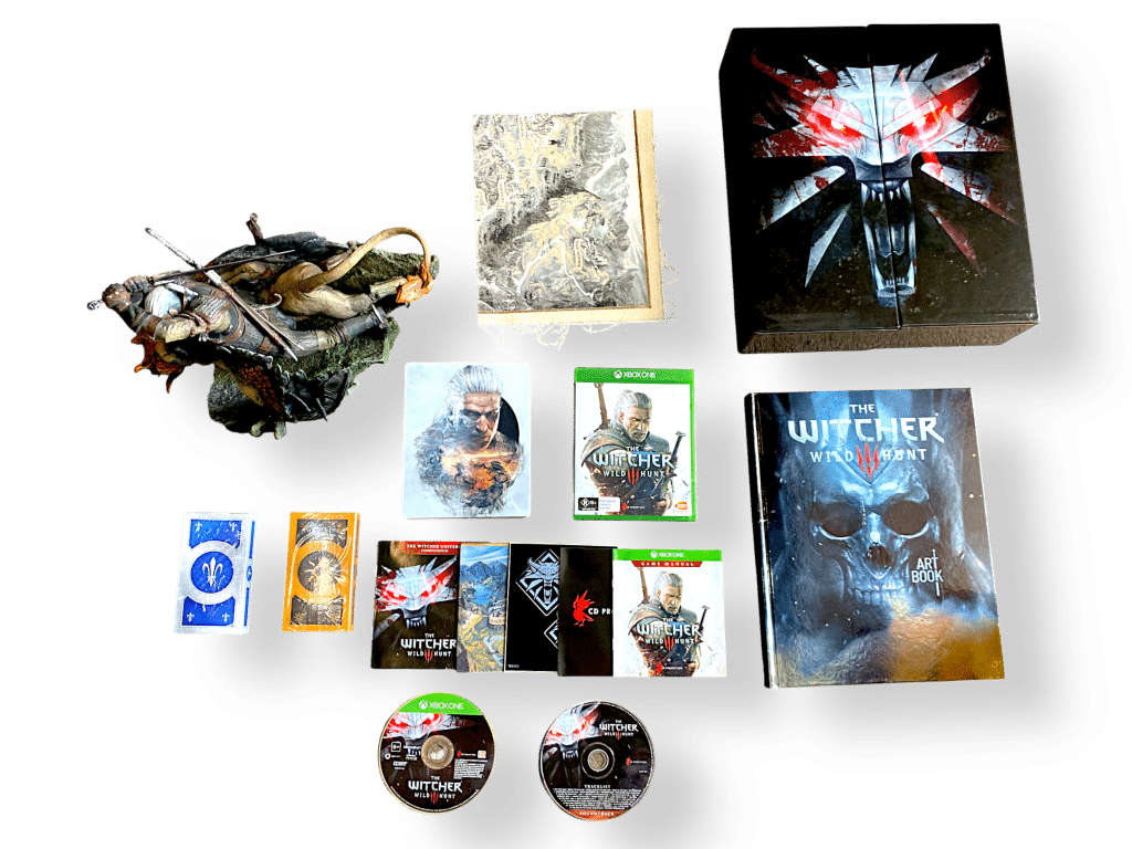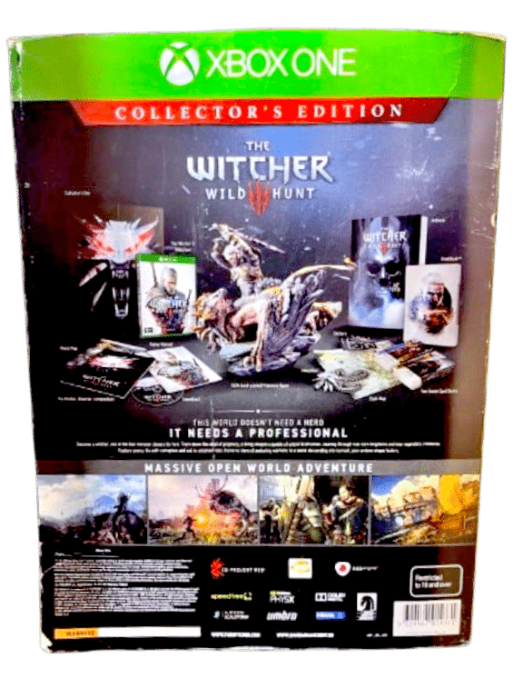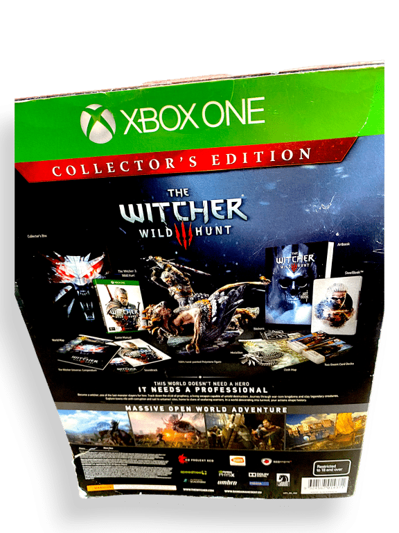 The Witcher 3: Wild Hunt – Collector’s Edition (Xbox One). HUGE Collector’s Boxed Edition in Excellent Condition and Complete with Inner Contents. This preowned ENORMOUS BOXED COLLECTOR’S BUNDLE contains some of the rarer Witcher collectibles inside – each in mint condition, and the outer box excellent with only mild shelf wear.