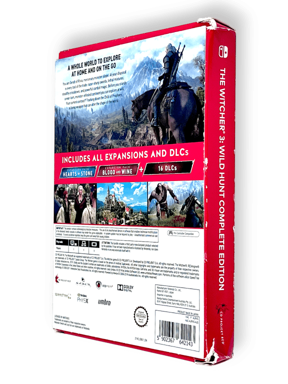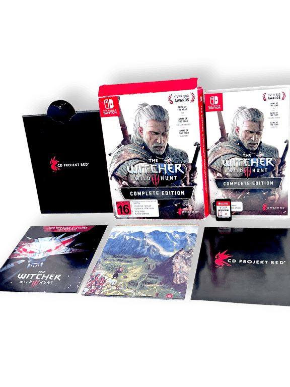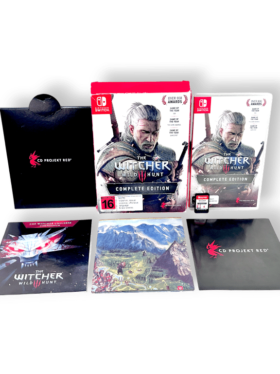 The Witcher 3: Wild Hunt – Complete Edition (Switch) *BOXED*. This pre-owned authentic limited release big box collector’s edition is in excellent condition and features original box and pictured internal game and contents. The box has some mild shelf wear, as can be seen in the photographs, but each of the internal contents are in as new condition. Refer to photographs.