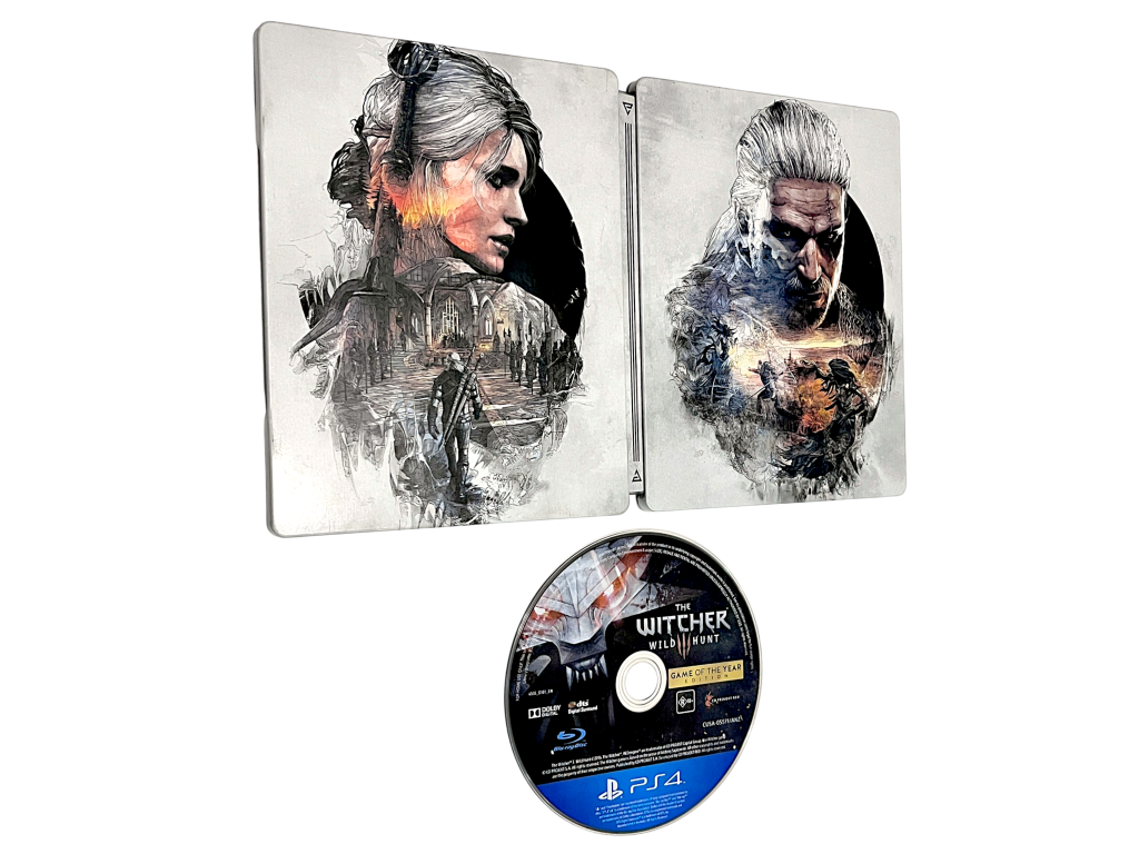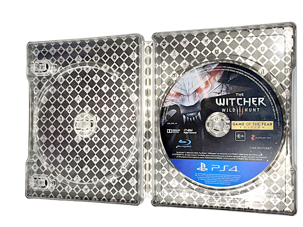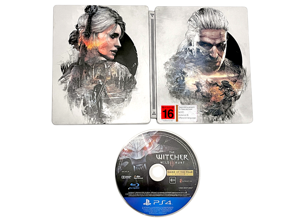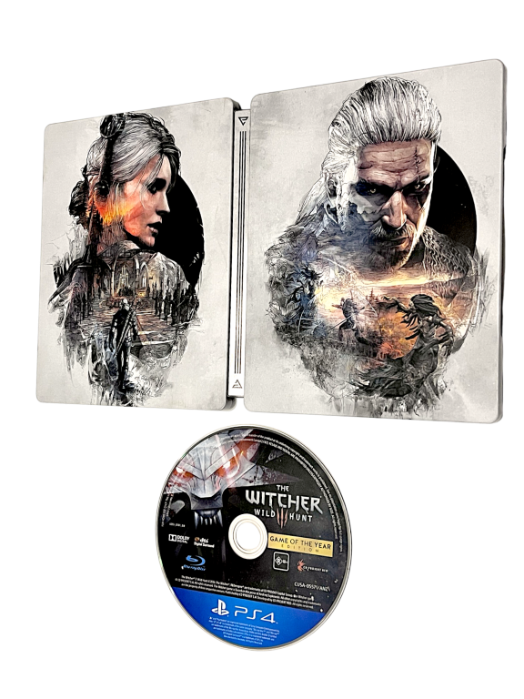 The Witcher 3: Wild Hunt GAME OF THE YEAR EDITION with STEEL COLLECTOR’S CASE (PS4). This pre-owned Sony PlayStation 4 game is in excellent condition and includes the pictured game disc plus limited release Steel Case. Refer to the photographs.