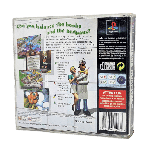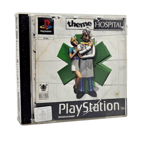 SONY PlayStation 1 game Theme Hospital. Game comes with original game case and disc, though front of case has scratches and markings. Condition as pictured.