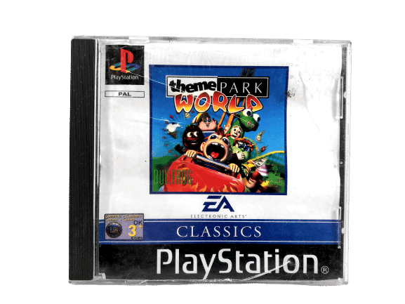 THEME PARK WORLD for SONY PlayStation 1 / PS1. This preowned game is in good condition and Includes case, front cover slip, and game disc. Missing rear cover sleeve. Disc has some light markings and superficial scratches which do not affect game play in any way. Case has some plastic cracks on the front panel, but these do not affect functionality in any way.