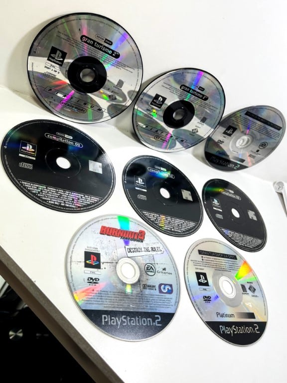 EIGHT Game Discs with scratches. Untested but likely need resurfaced: GRAN TURISMO 2 (PS1) + GRAN TURISMO 3 A-SPEC + The Lord of the Rings The Two Towers + BURNOUT 3 TAKEDOWN + more. All preowned with visible scratches. Have not been resurfaced, but will likely need resurfacing.