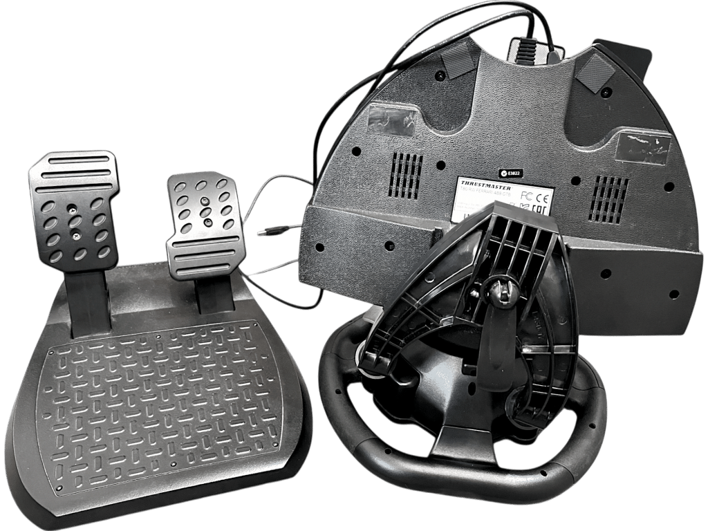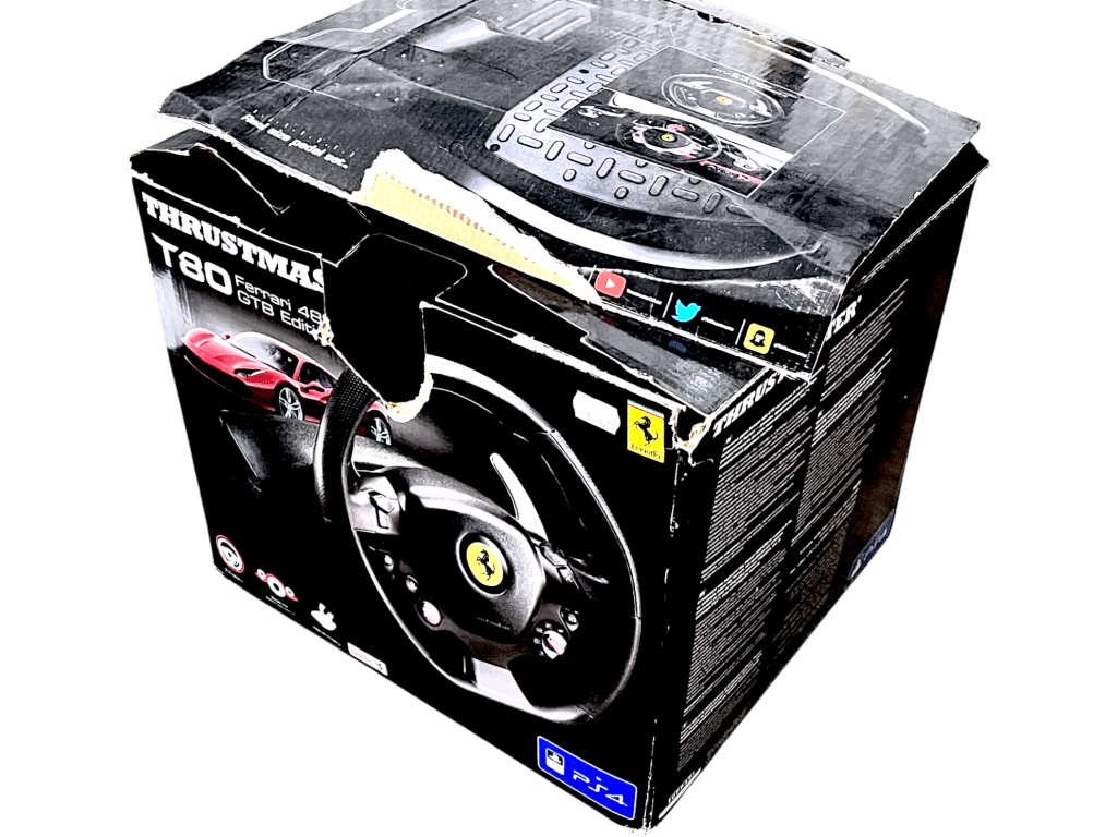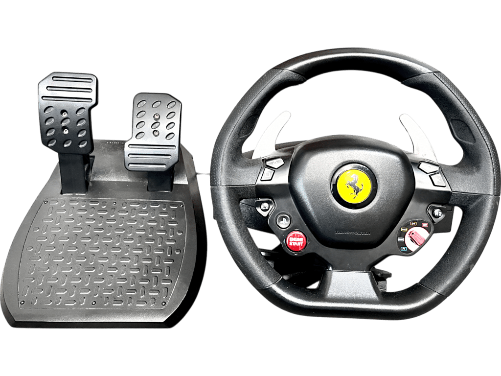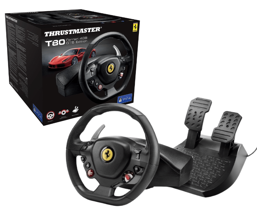 CURRENT MODEL Thrustmaster T80 Ferrari 488 GTB Edition Wheel. Selling elsewhere in stores for $269.00. This preowned PlayStation 4 and PC Gaming Wheel + Pedals driving simulation set up is in good condition and perfect working order, with some mild superficial imperfections.