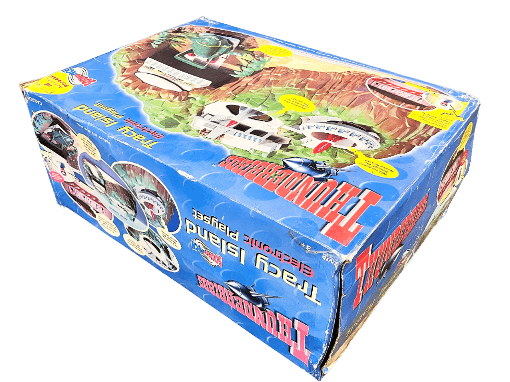 THUNDERBIRDS Tracy Island Playset complete with original box. This preowned LARGE toy bundle is in very good condition and comes as pictured. The original box is very large and features some card wear, but the internal contents – the toys themselves – are each very tidy. Refer photographs. Vivid Imaginations/Carlton, 1999.