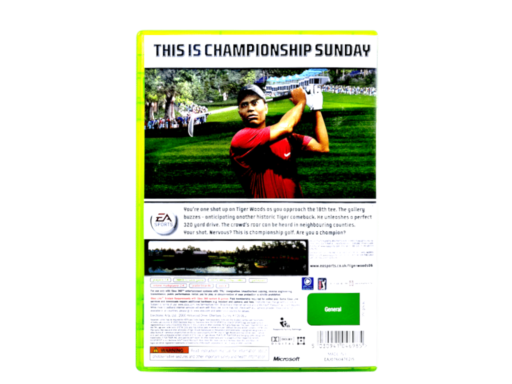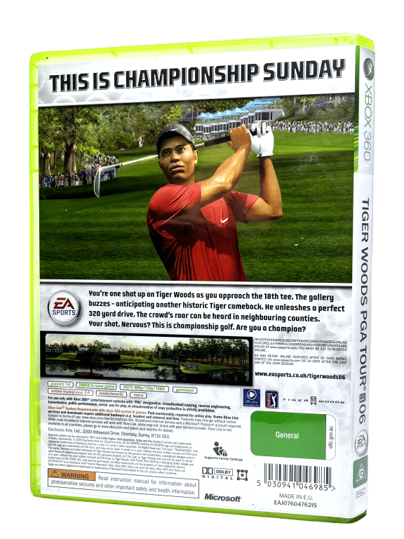Excellent condition & 100% complete with contents: EA Sports presents TIGER WOODS PGA TOUR ’06 (Tiger Woods PGA Tour 2006) for XBox 360. This preowned game is in superb condition and comes complete with case + cover + manual / booklet + game disc.
