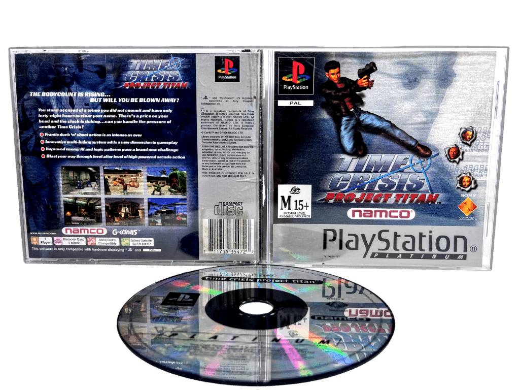 Time Crisis Project Titan for SONY PlayStation / PS1. This preowned game is in excellent condition and includes case + both covers (both front + reverse cover slips) + game disc.