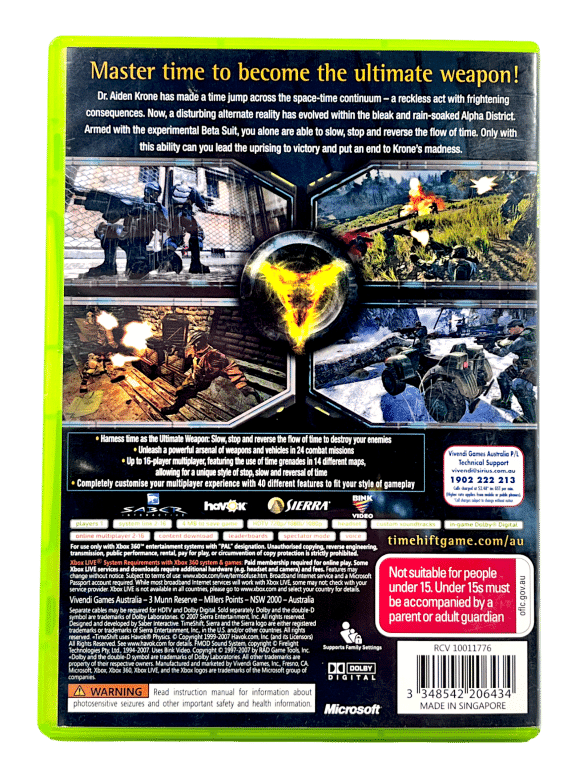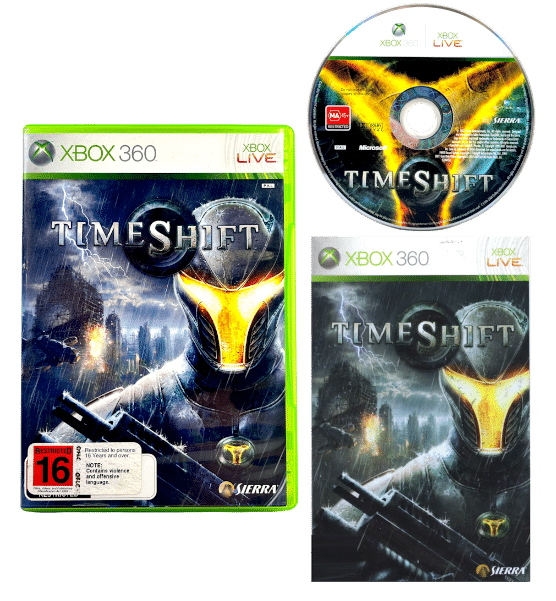 Excellent condition and 100% complete with contents: TIMESHIFT / Time Shift for Xbox 360. This preowned game is in excellent condition and includes case + cover + manual + game disc. A tidy and complete collector’s item.