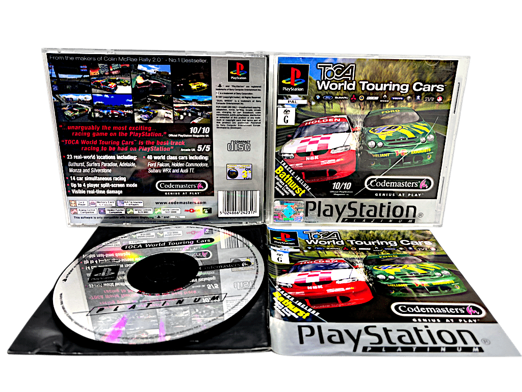 Genuine PLATINUM EDITION in Excellent Condition & 100% complete with contents: TOCA World Touring Cars for SONY PlayStation 1 / PS1. This preowned game comes complete with case, covers (both front and reverse cover slips), manual / booklet, and game disc. Front plastic panel of case has a small plastic crack pictured, but this is a purely cosmetic imperfection, and the contents inside are very tidy.