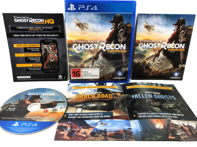 Excellent condition & 100% complete with contents: Tom Clancy’s Ghost Recon WILDLANDS for SONY PlayStation 4 / PS4. This preowned game includes cover, manual / booklet, and game disc. Mild laminate wear to case, but this extremely minor and purely cosmetic, and each of the internal contents are superb.