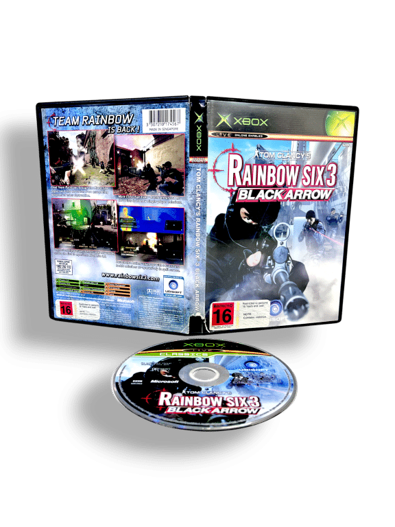 Tom Clancy’s Rainbow Six: Black Arrow for Original Xbox. This preowned game disc is in good condition with one light scratch which does not affect gameplay or performance. This game includes pictured black dvd case + game cover + game disc.