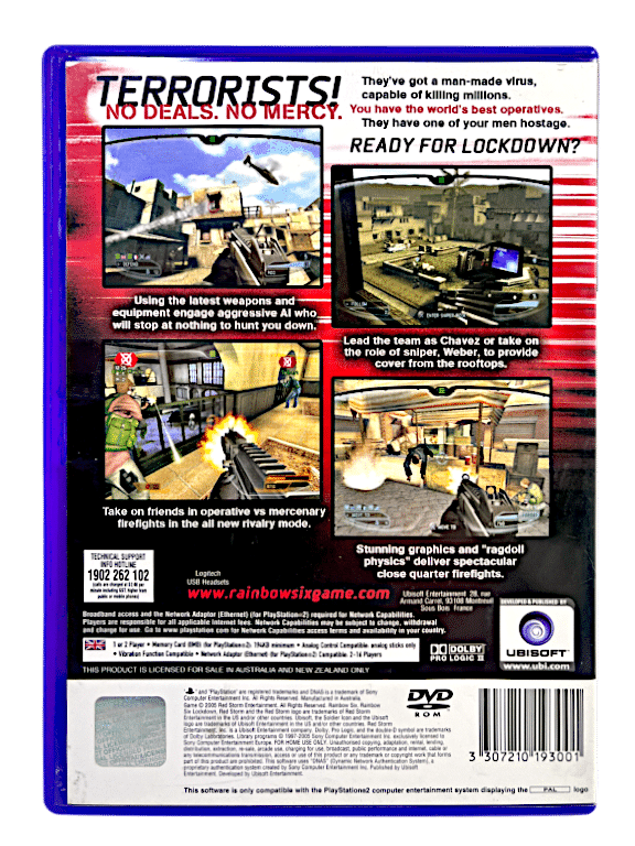 Rare Tom Clancy game in good condition & 100% complete with contents: Tom Clancy’s Rainbow Six Lockdown for SONY PlayStation 2 / PS2. This preowned game comes complete with case + cover + manual / booklet (each in excellent condition) + game disc. The game disc has light superficial markings / cosmetic scratches, but these are minor imperfections which do not affect game play in any way.