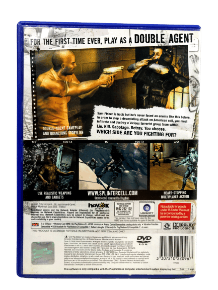 Tom Clancy’s Splinter Cell DOUBLE AGENT for SONY PlayStation 2 / PS2. This preowned game is in good condition with mild markings and surface scratches only as purely cosmetic imperfections which do not affect gameplay in any way. This game includes case + cover + game disc. Please note that the MANUAL IS NOT INCLUDED in this listing, but the game is self-explanatory, and the instructions are readily available online.