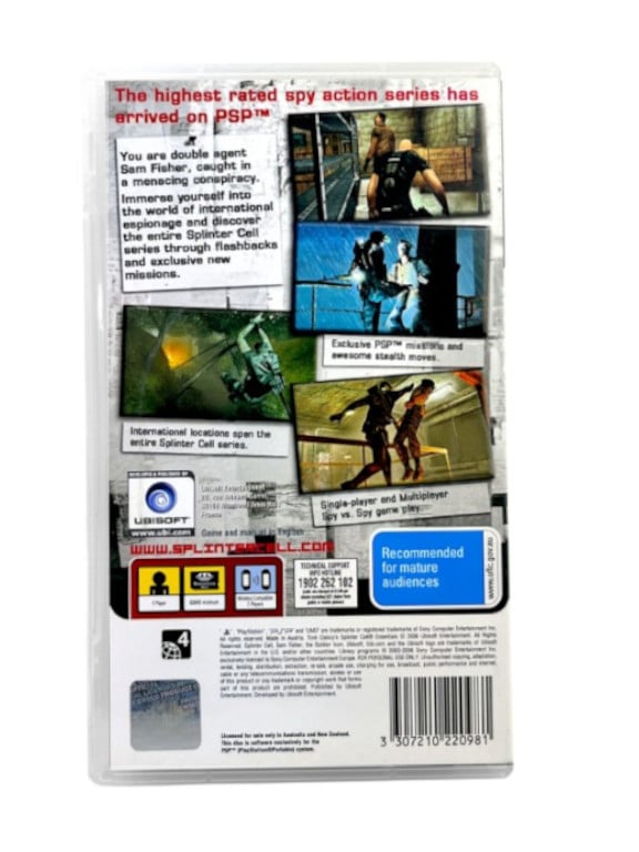 Tom Clancy’s Splinter Cell Essentials for SONY PSP (PlayStation Portable). This preowned game is in excellent condition and comes complete with case + cover + manual / booklet + game disc inside its miniature UMD case.