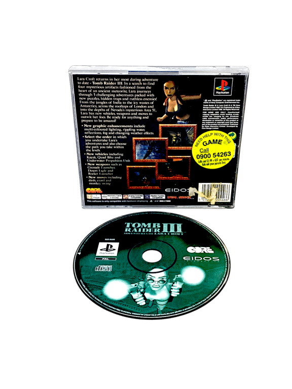 Tomb Raider III Adventures of Lara Croft (PS1)TOMB RAIDER 3 THE ADVENTURES OF LARA CROFT. This preowned game is in good condition with mild surface imperfections only which do not affect gameplay or performance in any way. This game includes pictured case + back cover + game disc. Front cover slip and manual not included.