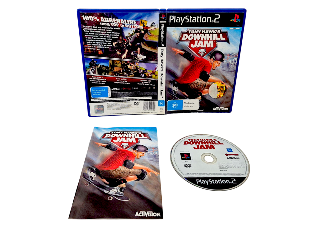 TONY HAWKS DOWNHILL JAM / Tony Hawk Down Hill Jam for SONY PlayStation 2 / PS2. This preowned game is in excellent condition, and includes case + cover + instruction manual / booklet + game disc. Game disc.