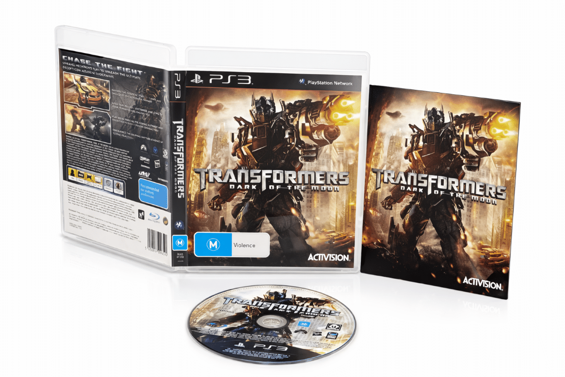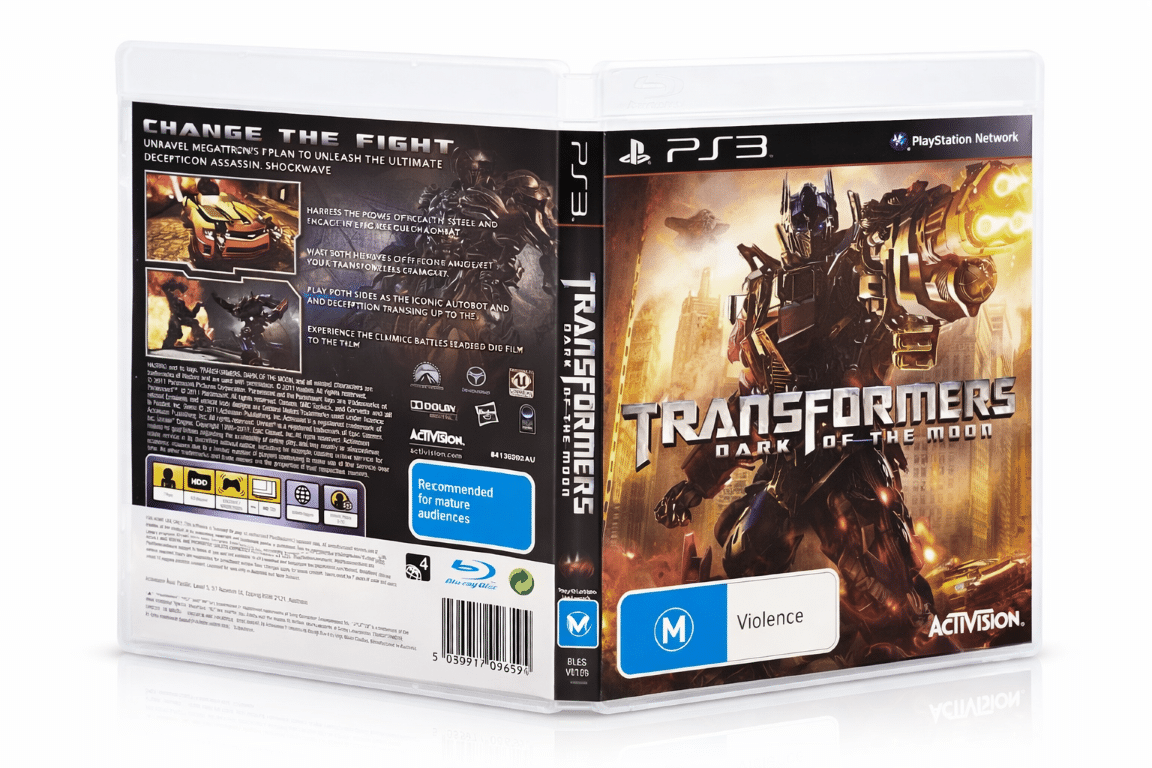 RARE Transformers Game in Mint Condition & 100% Complete with Contents: TRANSFORMERS DARK OF THE MOON for SONY PlayStation 3 / PS3. This preowned game is in superb condition – a tidy and complete collector’s item – with case, cover, manual / booklet, and game disc.