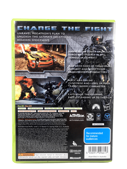 Excellent condition & 100% complete with contents: TRANSFORMERS DARK OF THE MOON The Video Game for XBox 360. This preowned game is in fine condition and comes complete with case + cover + manual / booklet + game disc. The faintest of superficial markings / cosmetic scratches, but these are extremely minor imperfections which do not affect game play in any way. The game disc is in very good condition and plays perfectly, and all other contents are superb.