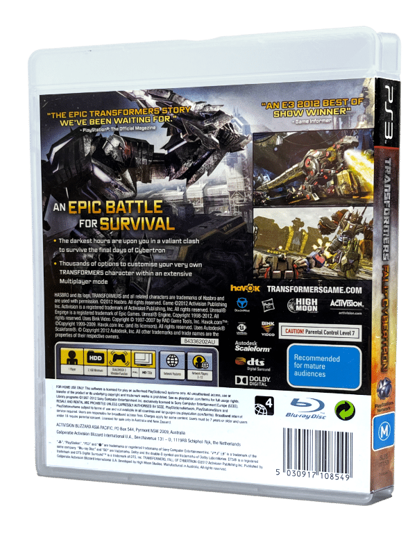 RARE FIND: AS NEW – MINT Condition & 100% Complete with Contents: TRANSFORMERS FALL OF CYBERTRON for SONY PlayStation 3 / PS3. Preowned, but AS NEW – PRISTINE CONDITION, and complete with case, cover, manual / booklet, and game disc. A very tidy and complete collector’s item. Refer photographs.