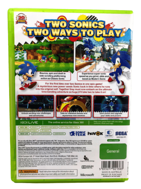 RARE FIND: AS NEW – MINT condition & 100% complete with contents: SONIC GENERATIONS for Xbox 360. This preowned game is in pristine condition and includes case + cover + manual / booklet + game disc. A very tidy and complete collector’s item, suitable as a gift.