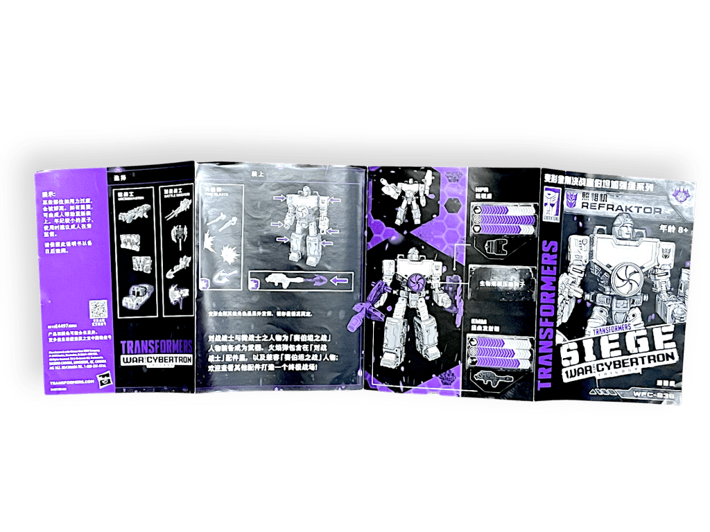 Transformers: War for Cybertron Siege Refraktor (WFC-S36) INSTRUCTION BOOKLET ONLY. This pre-owned Transformers instruction manual is just that: a fold-out instructional poster. Note that there is no Transformer or weapons or accessories included here. This is the instructions only. Refer photographs.