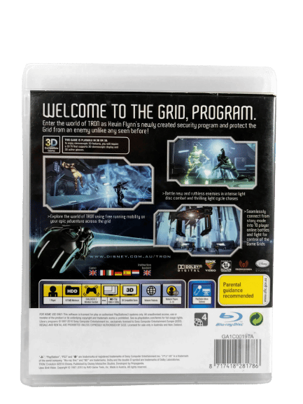 Genuine NZ Print in excellent condition & 100% complete with contents: TRON EVOLUTION the game for SONY PlayStation 3 / PS3. This preowned game is in very tidy condition, and comes complete with case, authentic New Zealand / AUS cover (with the signature “PG” classification embedded in the cover art), manual / booklet, official Tron Evolution voucher card (voucher expired), and game disc. A tidy and complete collector’s item.