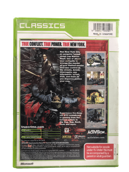 Good condition & 100% complete with contents: TRUE CRIME NEW YORK CITY for Original XBox. This preowned game comes complete with case, cover, manual / booklet each in excellent condition. Some light superficial markings / cosmetic scratches to the disc, but these are minor imperfections which do not affect game play.