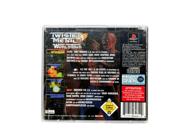 Good condition & 100% complete with contents: TWISTED METAL WORLD TOUR for SONY PlayStation / PS1. This preowned game comes complete with Complete with Case, Covers (both front and reverse cover slips), Manual / Booklet, and Game Disc. Disc has some light superficial markings / scratches, and these minor imperfections which do not hinder game play in any way. Game has been tested. A complete collector’s item. Refer images.