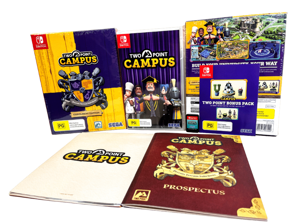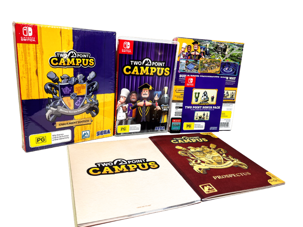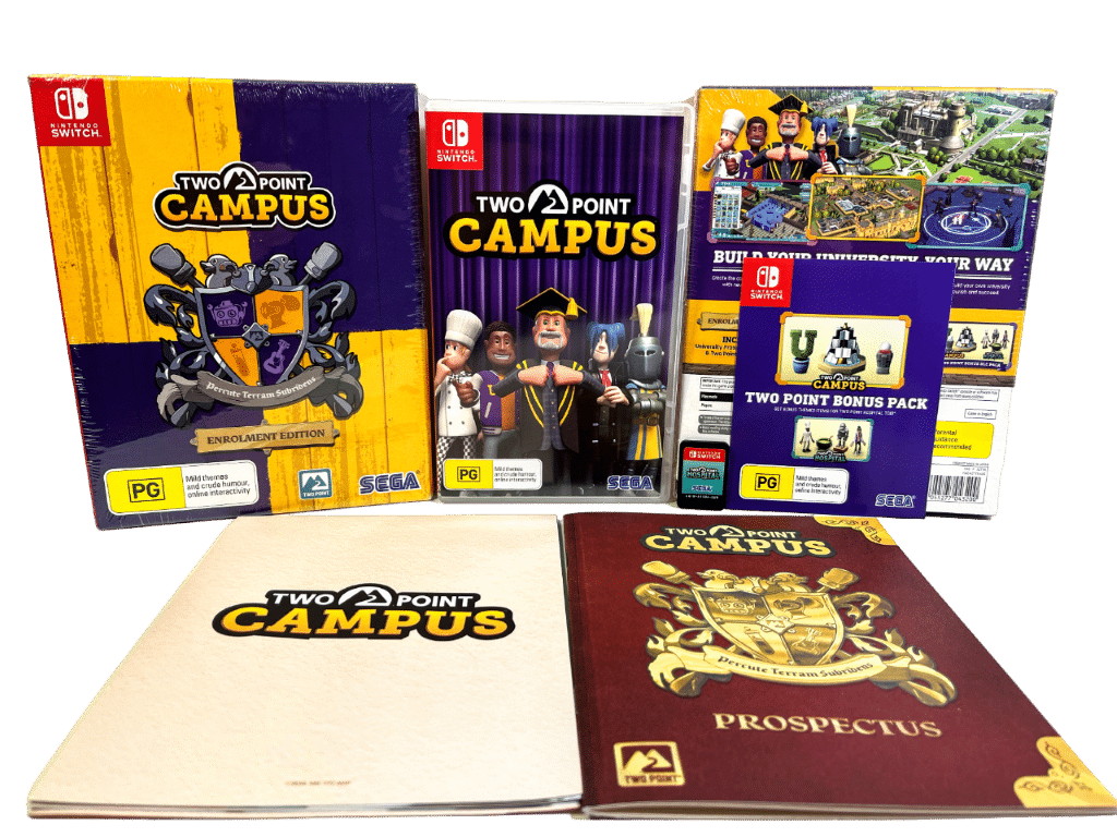 Excellent Condition & 100% Complete with Contents: Two Point Campus: Enrolment Edition for Nintendo Switch. Preowned but As New in Box & complete with Full Game on Cartridge + ALL COLLECTOR’S CONTENTS: