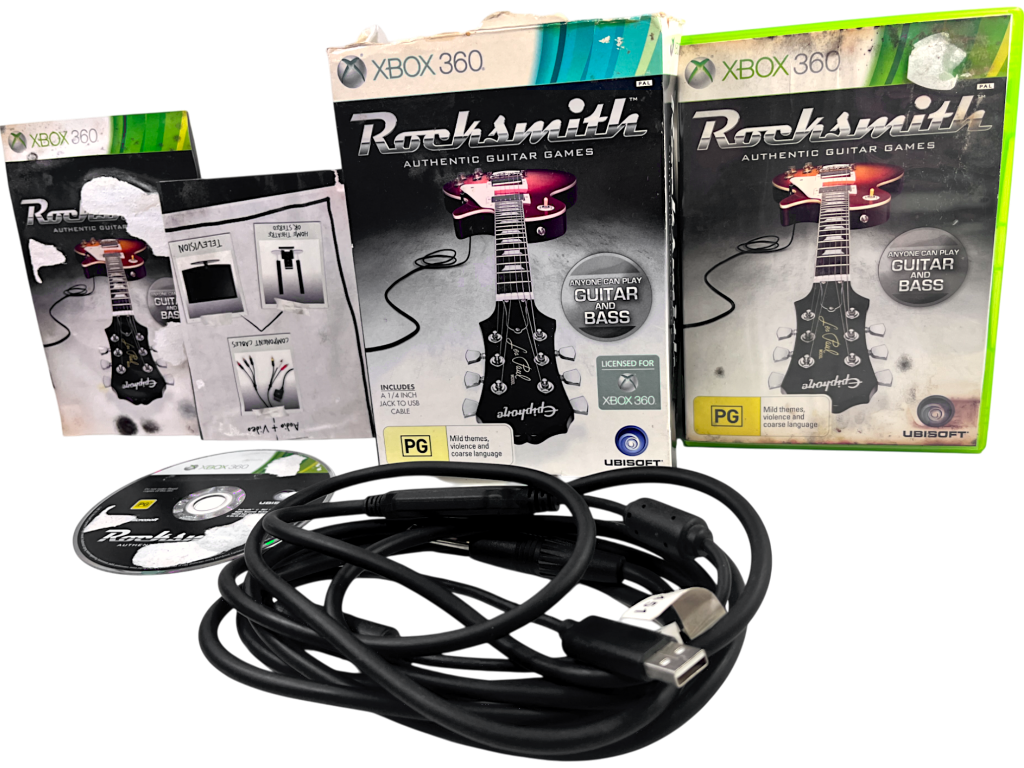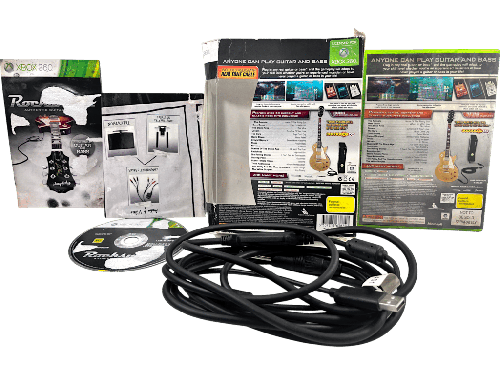 COMPLETE MATCHING BUNDLE: Official Ubisoft Rocksmith Guitar Cable, Breakaway Lead with USB Adapter to connect to your XBox 360, and Rocksmith the XBox 360 Edition Game: ROCKSMITH: Learn To Play Guitar for Xbox 360. This preowned Genuine Ubisoft RockSmith cable is in excellent condition, as is the Rocksmith game disc. The box and paperwork show considerable card wear as pictured, the result of the papers being soaked. But the game disc itself and the Rocksmith cable are each excellent.Â