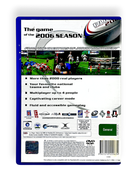 Ubisoft’s Rugby Challenge 2006 for SONY PlayStation 2 / PS2. This preowned game is in very good condition with only light disc surface markings and scratches, and includes case + cover + game disc. Please note that the MANUAL IS NOT INCLUDED in this listing, but the game is self-explanatory, and the instructions are readily available online.