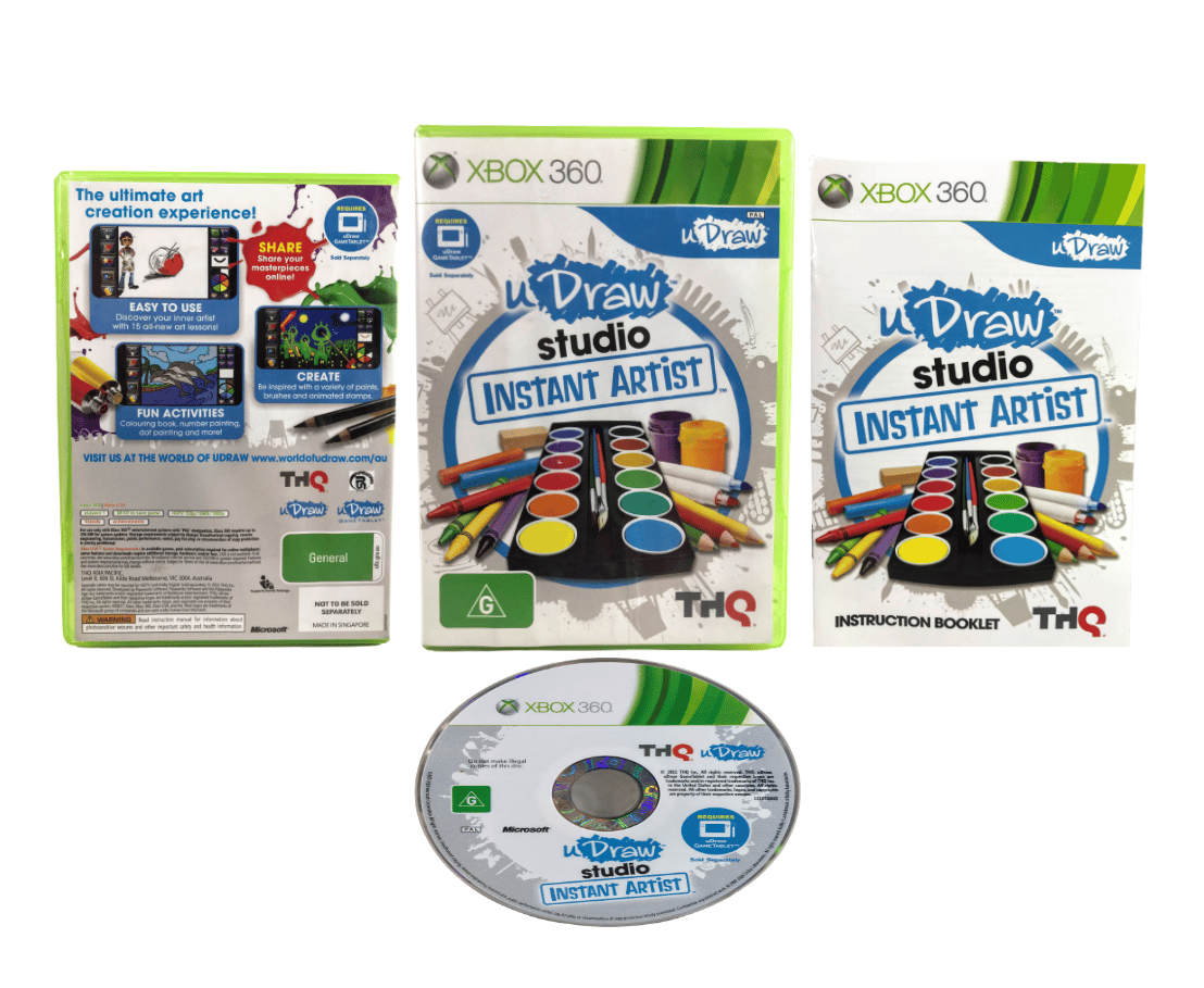 RARE Wireless Gamepad PLUS Game Set: uDraw Game tablet with uDraw Studio Instant Artist Game for XBox 360. This preowned bundle is a nice matching set, with the game in excellent condition & 100% complete with manual. The game tablet includes its drawing pen. The tablet is in good condition with only fine cosmetic markings and superficial scratches consistent with use, but which do not inhibit functionality in any way. Gamepad requires 3 x AA Batteries (batteries not included). The plastic battery hatch on the back is missing, but batteries stay firmly in place, and can be doubly secured using tape.