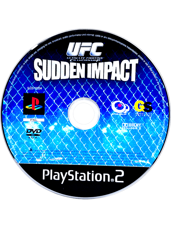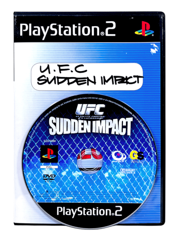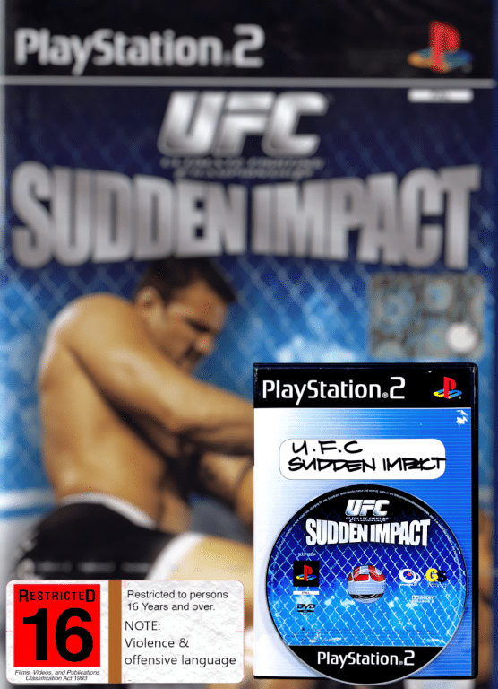 UFC Sudden Impact for SONY PlayStation 2 / PS2. This preowned game disc is in very good condition with only faint surface imperfections which do not affect gameplay or performance in the slightest. This game comes inside pictured black case with EB Games cover (not original case). Refer images 2 – 4.