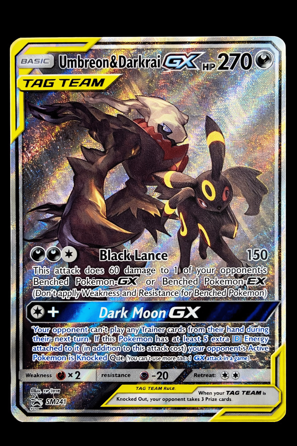Umbreon & Darkrai GX is a TAG TEAM Pokemon card focused on Dark-type strategies and disruption. Featuring strong attacks and stylish artwork, it has been popular in both competitive play and collections. A standout card from the TAG TEAM GX era.