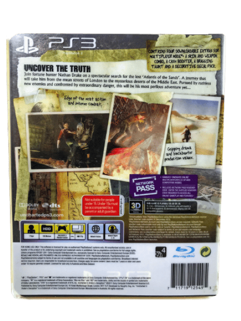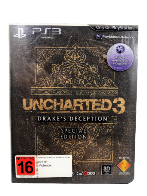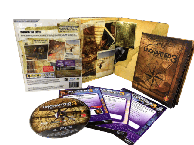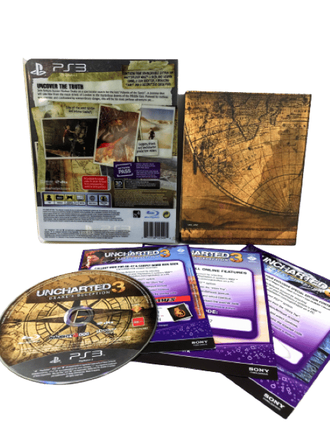 RARE COLLECTOR’S “SPECIAL EDITION” in Mint Condition & 100% Complete with Contents: UNCHARTED 3 DRAKE’S DECEPTION Collector’s Edition / Special Edition. This preowned genuine Limited Edition is in pristine condition, and comes complete with Official Limited Edition Plastic Display Sleeve, Uncharted 3 Felt Collector’s Book, Collector’s poster, carded inserts, and Game Disc. A very tidy and complete collector’s bundle. Refer photographs.