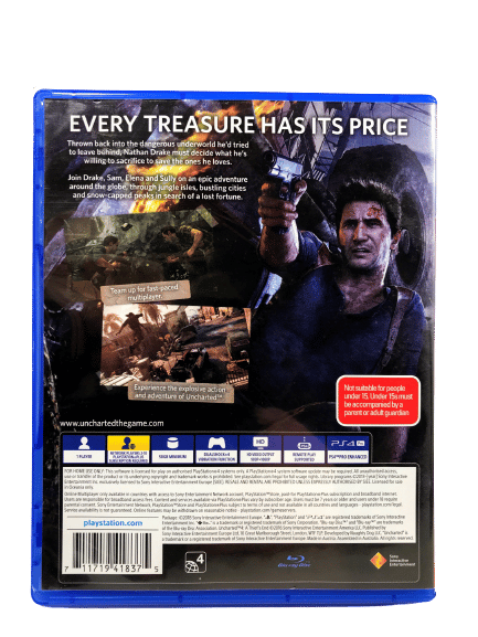 Excellent Condition and Complete with Contents: Uncharted 4: A Thief’s End for SONY PlayStation 4 / PS4. This preowned game comes complete with case, cover, official Uncharted 4 carded insert, and game disc.