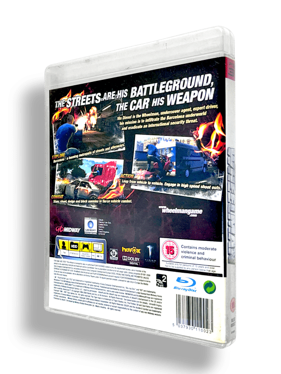 Wheelman is an open-world action-driving game developed by Midway Studios and starring Vin Diesel as the main character, Milo Burik. Set in a detailed recreation of Barcelona, the game combines high-octane car chases, explosive stunts, and third-person shooting in a story of crime, betrayal, and revenge. Players take control of Milo, navigating the city’s streets while performing daring escapes, vehicular takedowns, and cinematic missions. The game is known for its mix of driving and combat mechanics, plus the inclusion of interactive destructible environments.