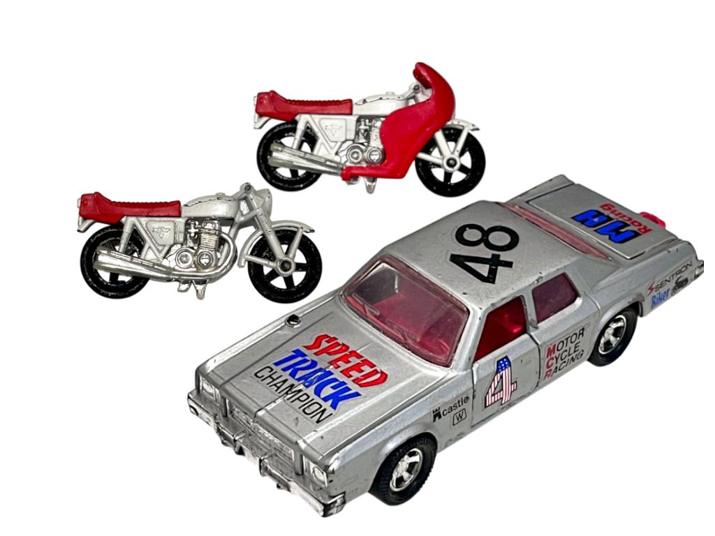 Vintage Matchbox SuperKings K-91 Motorcycles + Plymouth Gran Fury (1983). Genuine vintage die cast collectible toy. Vintage Matchbox SuperKings K-91 Motorcycle Racing Set Plymouth Gran Fury Speed Track Champion. This preowned Genuine 1982 – 1984 Matchbox Vintage Die-Cast Stock Car “Speed Truck Champion” #48 (Vintage 1980s) is in very good condition as pictured. The car and motorcycles / bikes are each in excellent condition. TRAILOR NOT INCLUDED.