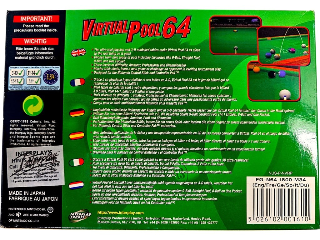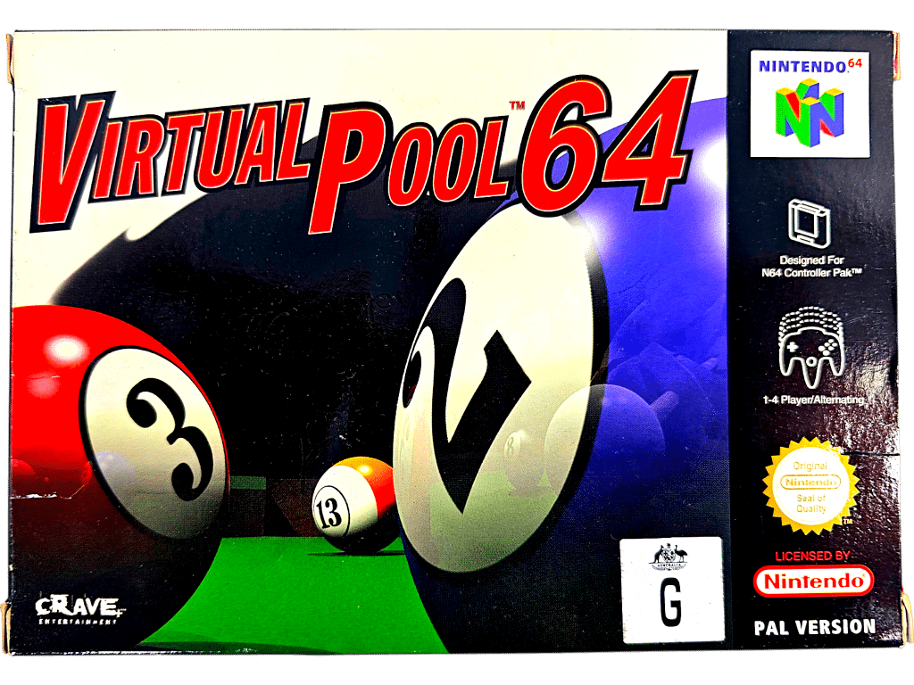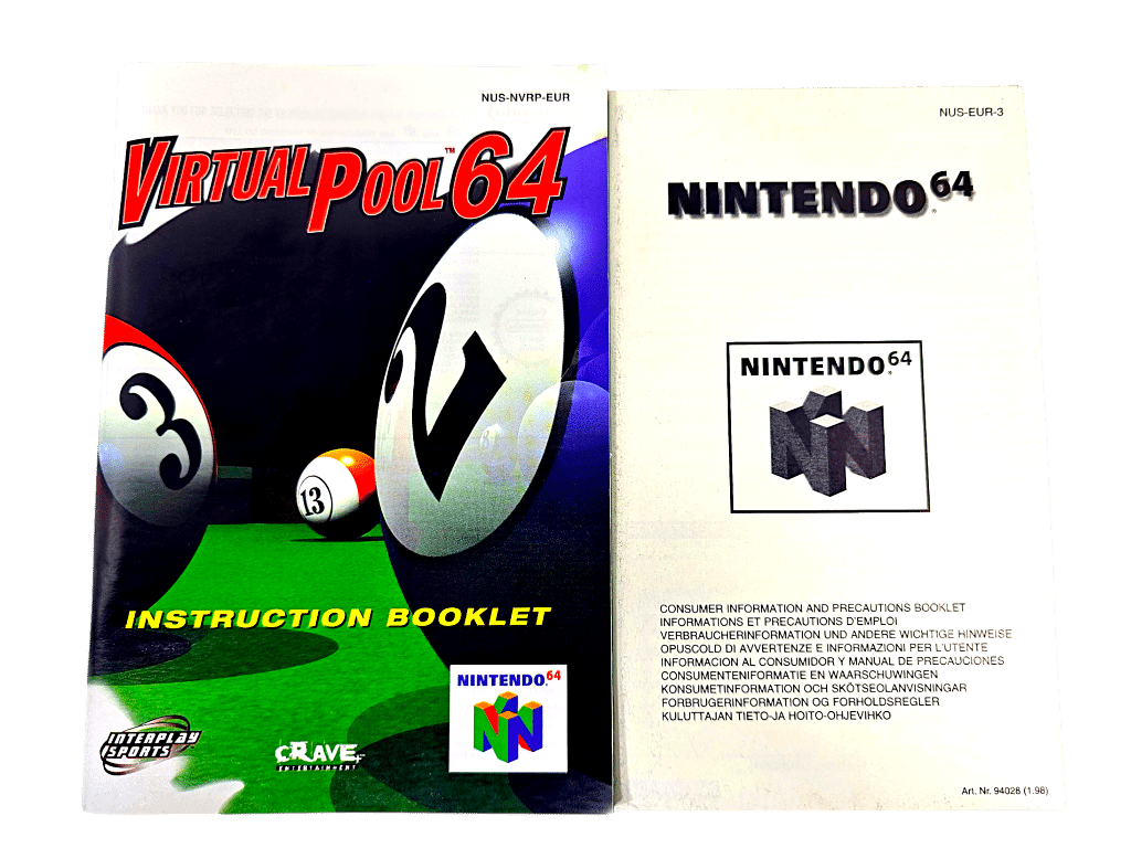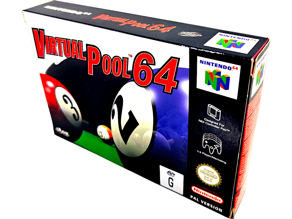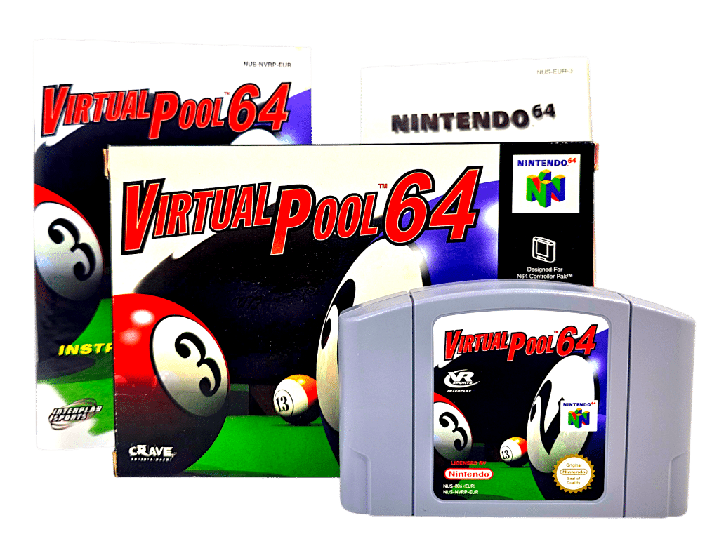 Excellent Condition & 100% Complete with Contents: VIRTUAL POOL 64 for Nintendo 64. This preowned game is in superb condition and comes complete with pictured Box + Instruction Manual + Nintendo Booklet + Game Cartridge.