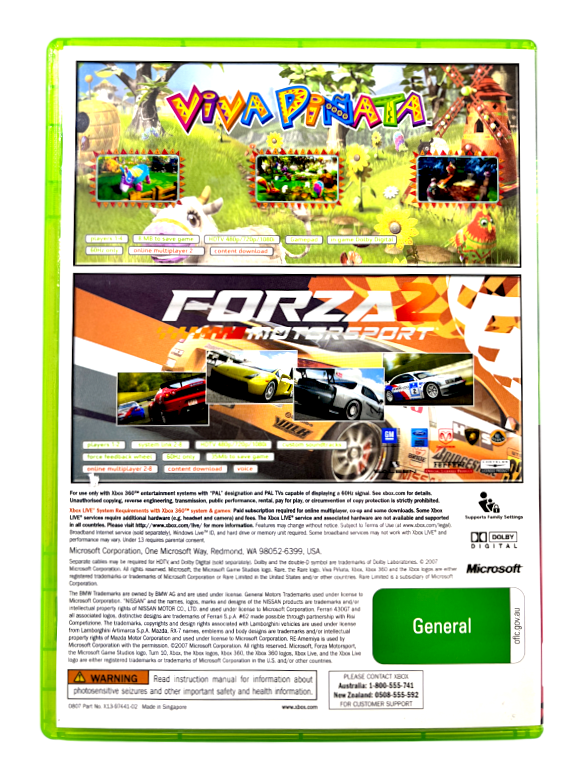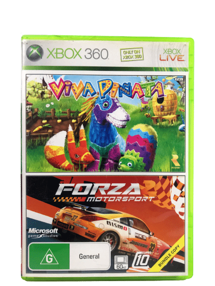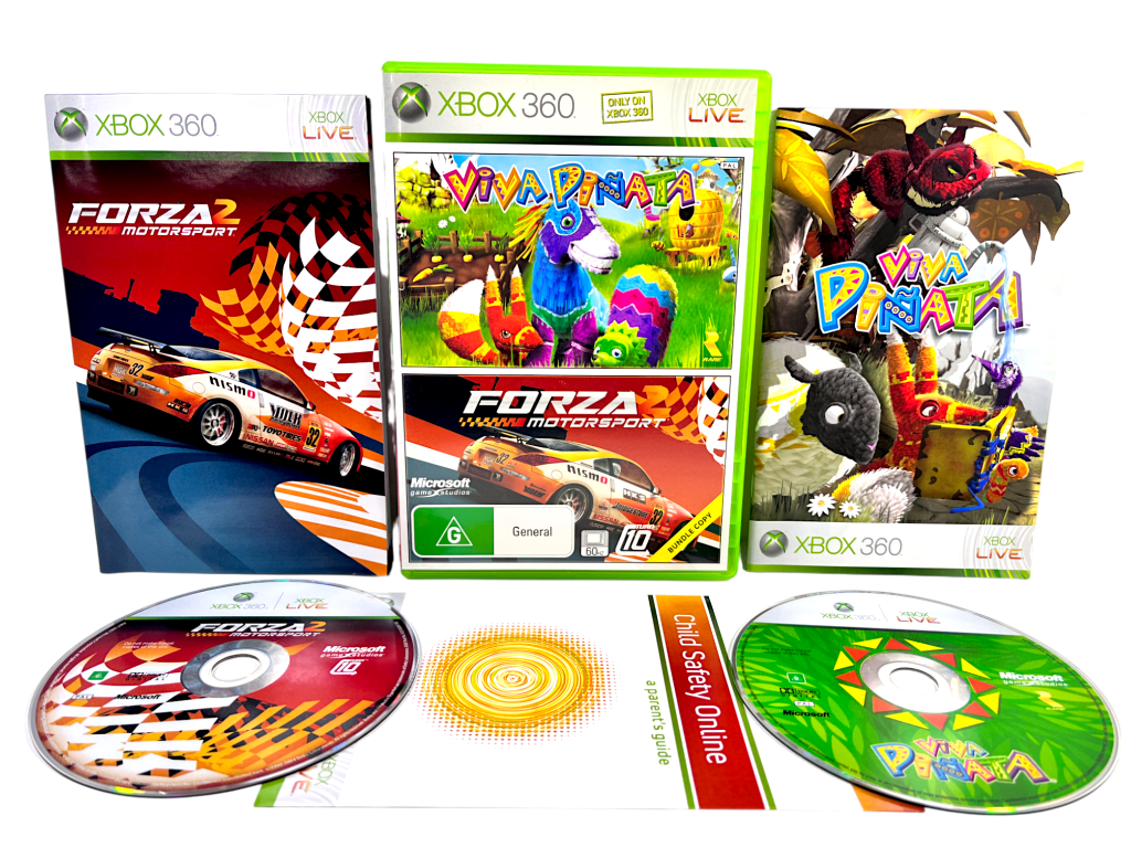 TWO COMPLETE GAMES IN ONE DOUBLE PACK in excellent condition & 100% complete with contents: Viva Pinata PLUS Forza Motorsport 2 for XBox 360. This preowned double game pack is in superb condition and comes complete with case, cover, Forza 2 Manual, Viva Pinata Manual, Child Safety Online Booklet, Viva Pinata game disc + Forza Motorsport 2 game disc.