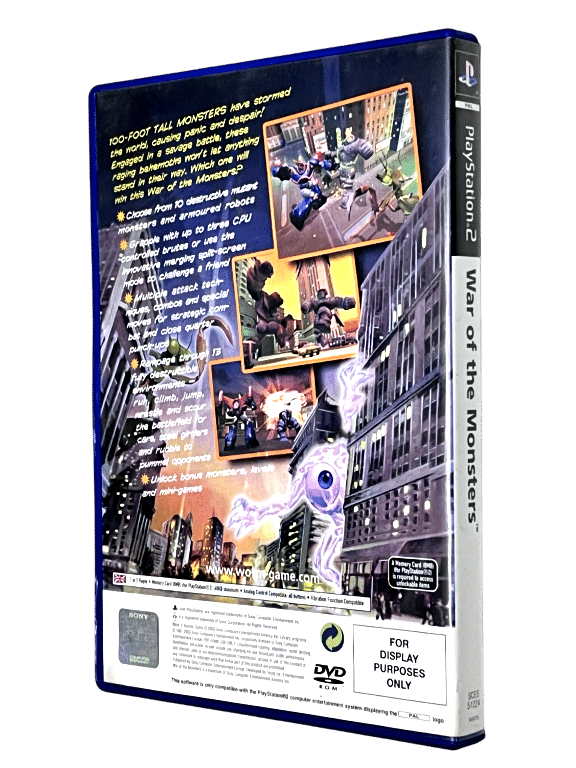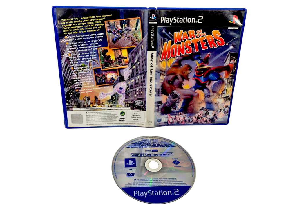 This preowned game is in good condition with only mild markings and surface scratches that do not inhibit gameplay or performance in the slightest and comes complete with genuine pre-release case cover and game disc with the full WAR OF THE MONSTERS Sony PlayStation 2 game on the disc.