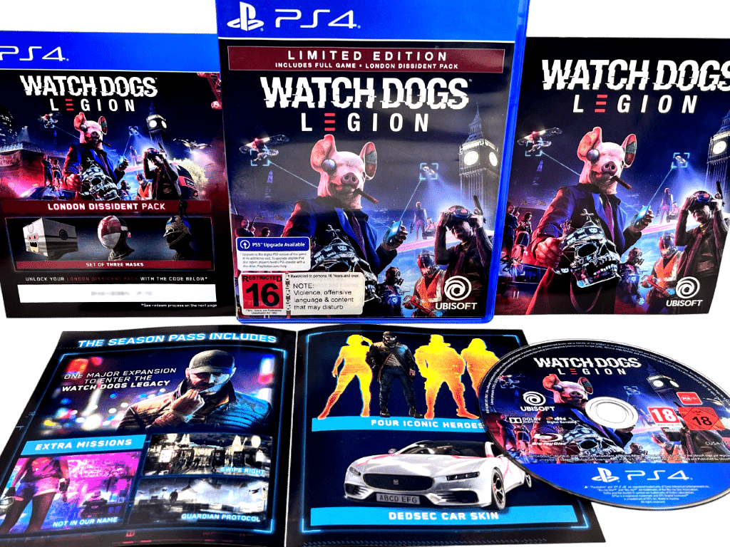 Special Limited Edition Cover Variant in Mint Condition & 100% complete with Contents: WATCH DOGS LEGION / Watch_Dogs Legion / WatchDogs Legion for SONY PlayStation 4 / PS4. This preowned game is a tidy and complete collector’s item, complete with case, cover, manual / booklet, carded inserts, and game disc. Please note that any bonus paper voucher content will have expired, but these vouchers are add-ons only, and in no way required for game play. The Full Watch Dogs Legion game is included on the game disc.