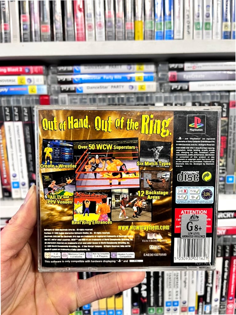 WCW vs NWO THUNDER / WCW/NWO THUNDER / WCW / NWO THUNDER for SONY PlayStation / PS1. This preowned game is in good condition with mild disc surface imperfections only, and includes original case + covers (both front and back cover slips) + game disc. Manual not included.