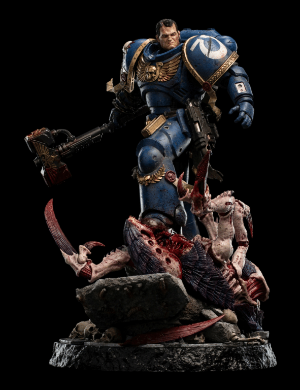 A high-detail, limited edition statue of Lieutenant Titus, a celebrated Space Marine from the Ultramarines chapter. This collectible showcases his power armor, bolter, and stoic heroism in a dramatic fighting pose.