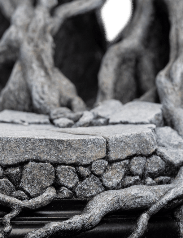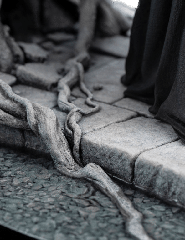 Silent and steadfast, for silk wrapped their faces as a reminder of their oath, he stood there, a sentinel of the realm, keeping a watchful eye over the White Tree. Its roots, intertwined like the ancient bonds and vows of old, drank gently from the fountain’s waters, prolonging its final breath, while its branches, sparse strokes of ivory, danced gently in the breeze, whispering tales of a kingdom’s resiÂlience.