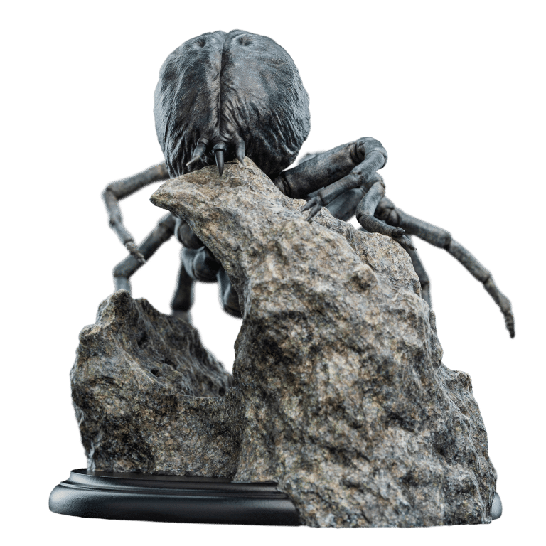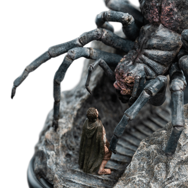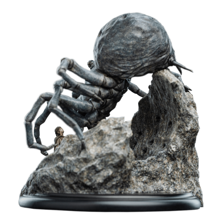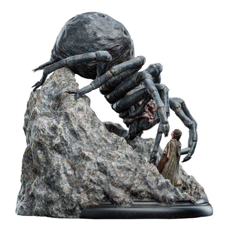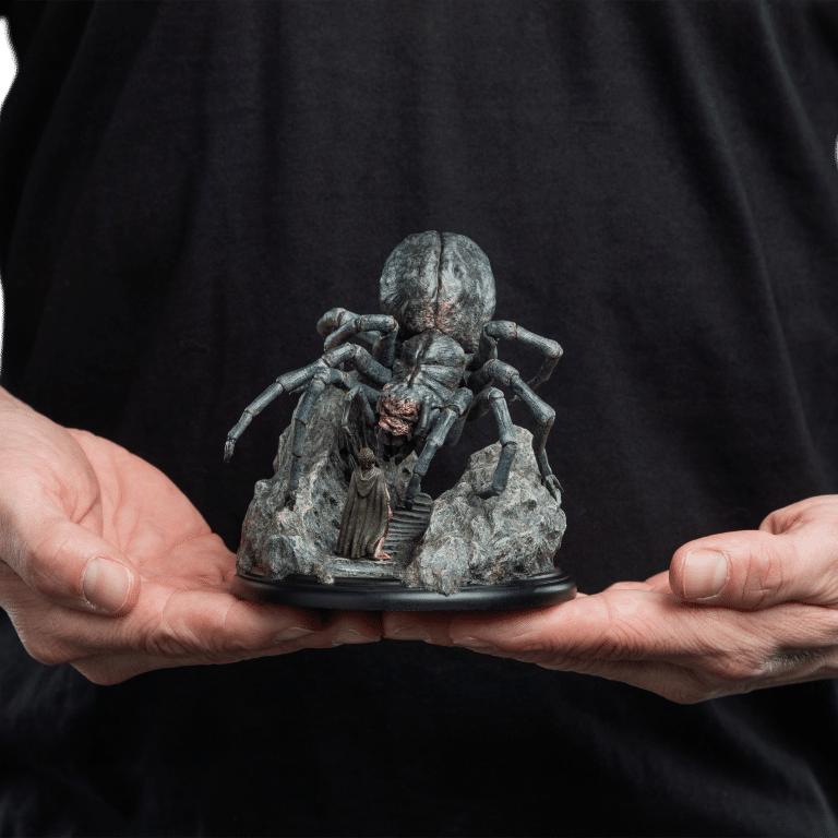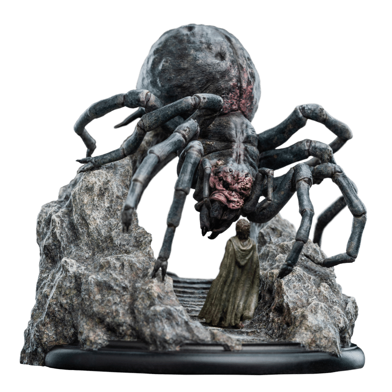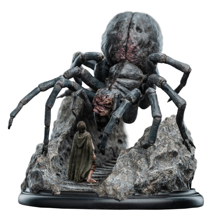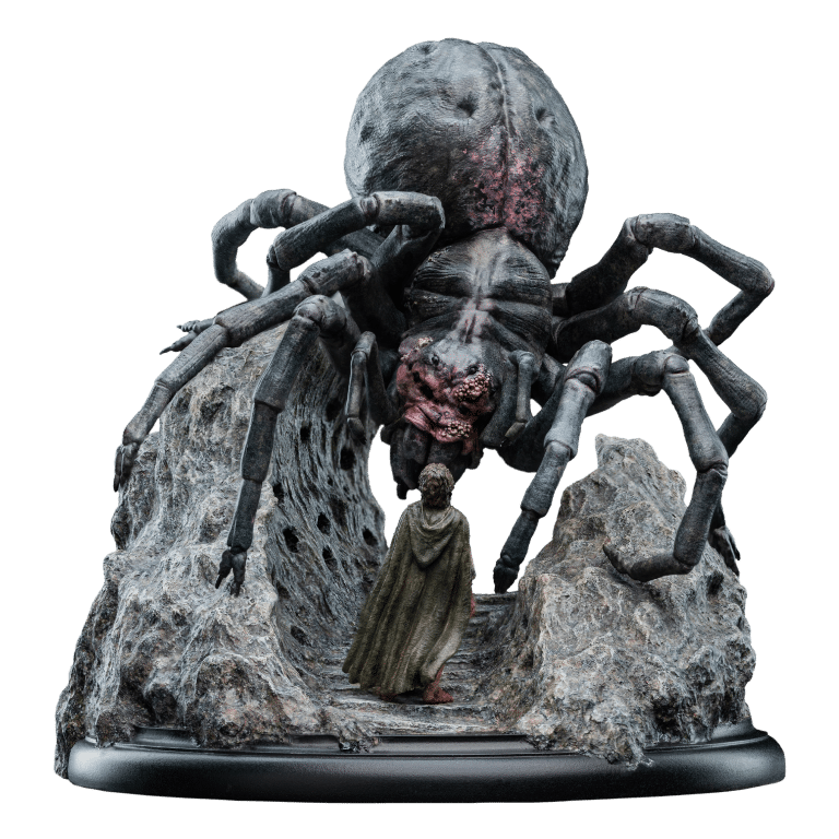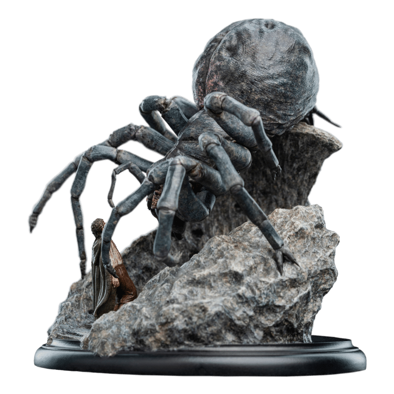 Wētā Workshop was intrinsically involved in the design and physical effects manufacture for all three films of The Lord of the Rings™ trilogy. Poised to strike, her many-eyed visage glowing with a malevolent gleam, Shelob towered over a small, trembling form. The helpless hobbit stood dwarfed beneath her vast, bloated figure, unaware of the vile fate soon to befall upon him within the jagged rocky paths of the creature’s domain. Another poor soul, caught within her venomous grasp; prey for her insatiable hunger. “Relive the heart-pounding tension and thrilling adventure of The Lord of the Rings with the newest addition to our miniature statue collection. This exquisite piece will transport you back to the unforgettable moment when Frodo faced his darkest terror, capturing the essence of the film that captivated millions.