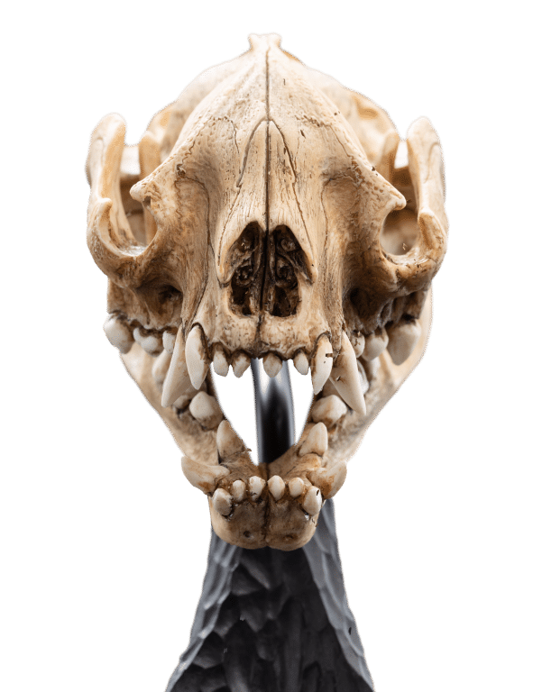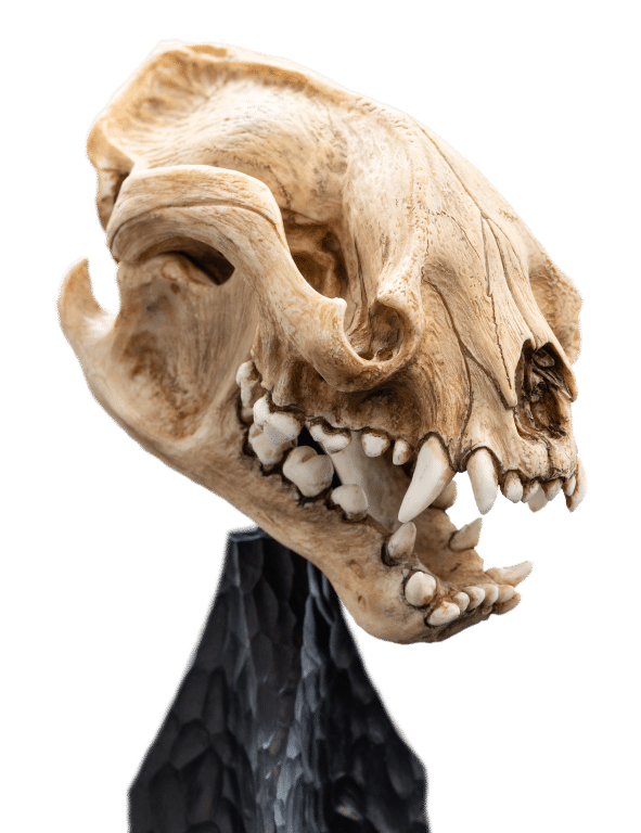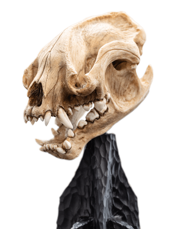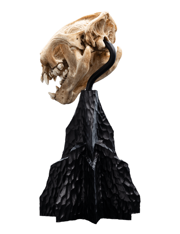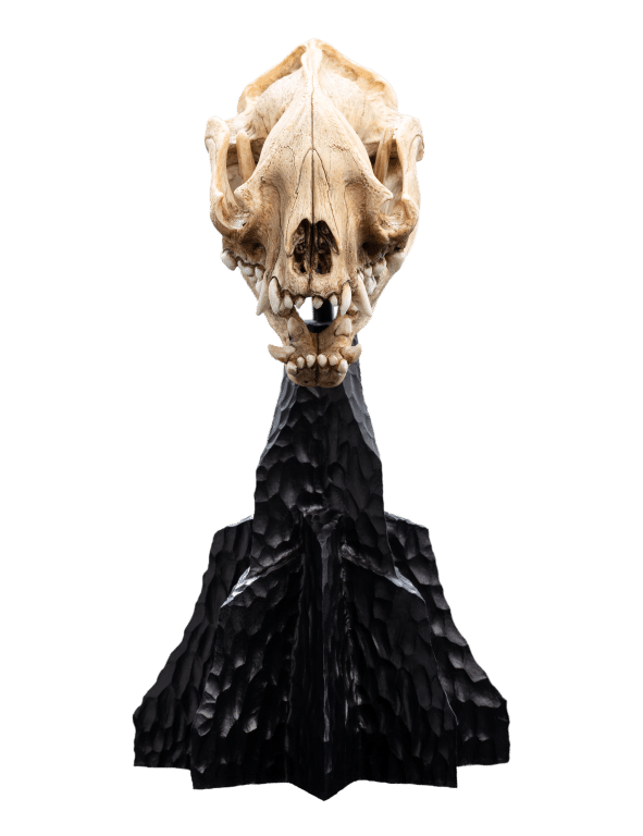 Wētā Workshop was intrinsically involved in the design and physical effects manufacture for all three films of The Lord of the Rings™ trilogy. The skull of a Warg is a remarkable specimen, reflecting both the predatory prowess and the evolutionary adaptations of this formidable creature. “Its elongated snout and pronounced sagittal crest suggest powerful jaw musculature, optimized for gripping and tearing. The robust dentition features prominent, conical canines and interlocking molars, indicating a carnivorous diet focused on hunting large prey.