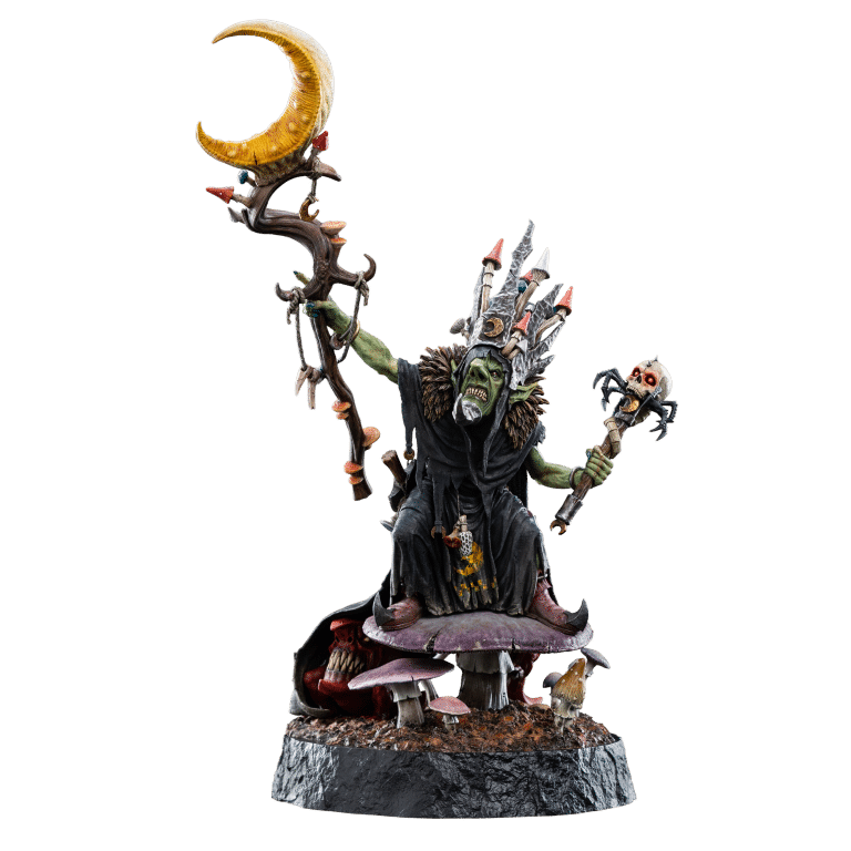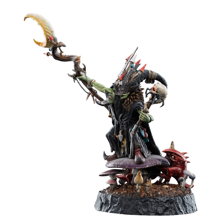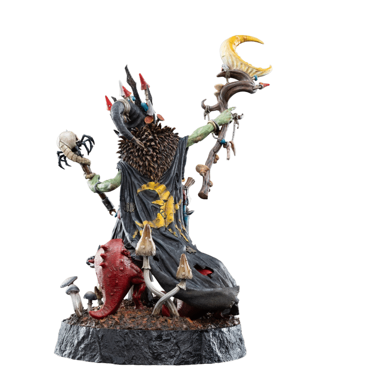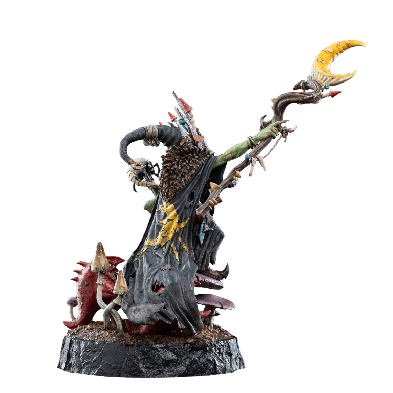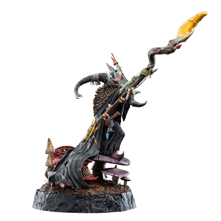 The dynamic pose and lifelike features reveal the deep attention to the character’s essence—his malice, cunning, and unyielding ambition are palpable. Whilst hidden within the fungal base, a pair of hungry and mischievous squigs gnaw and gnash without restraint.